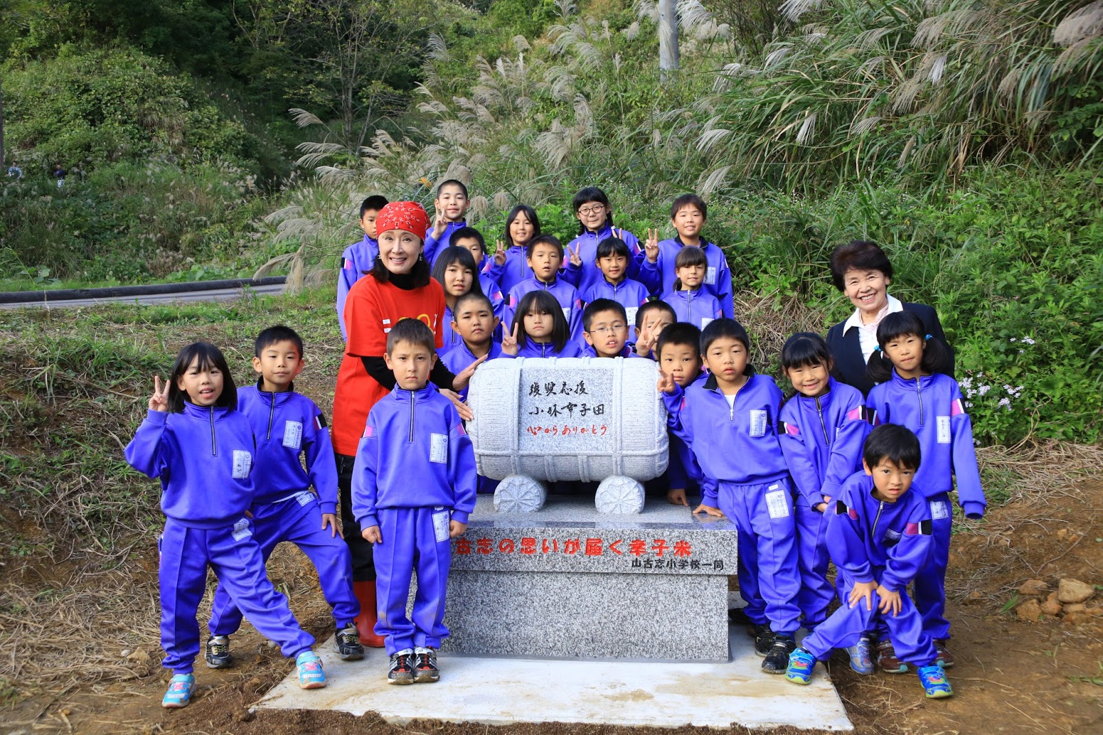 石碑除幕の瞬間子供たちの歓声が山々にこだましました